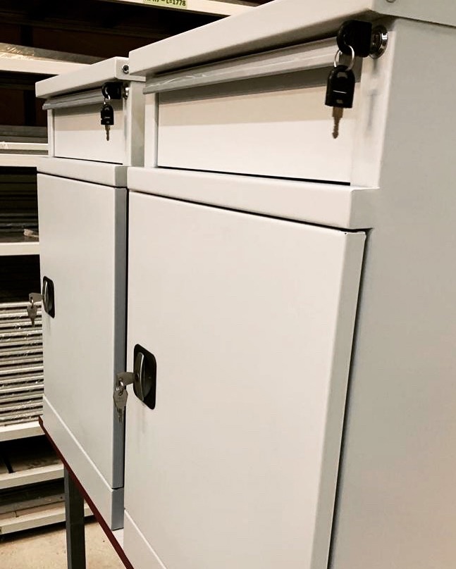Металлическая тумба ТC-2 оборудована ригельным замком с ручкой и поставляется в комплекте с 2 ключами. Ящик тумбы имеет замок для индивидуального доступа. Корпус и полка изготовлены из листового металла для увеличения эксплуатационного ресурса и повышения надежности.